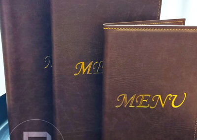 – Bìa PVC bảo vệ, chống nước và bẩn – Giấy menu tráng nhựa foliert – Lau được, không thấm nước