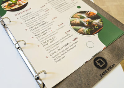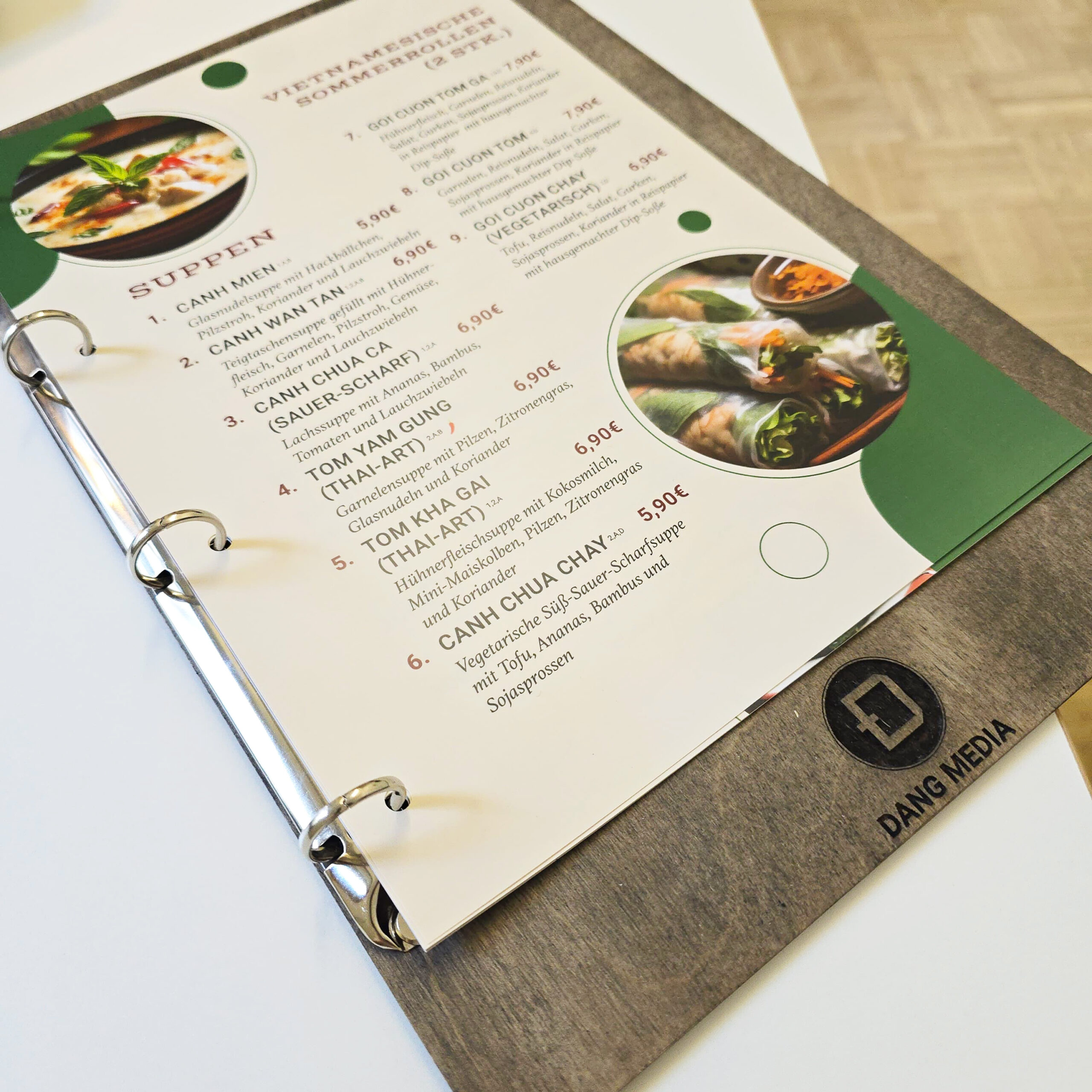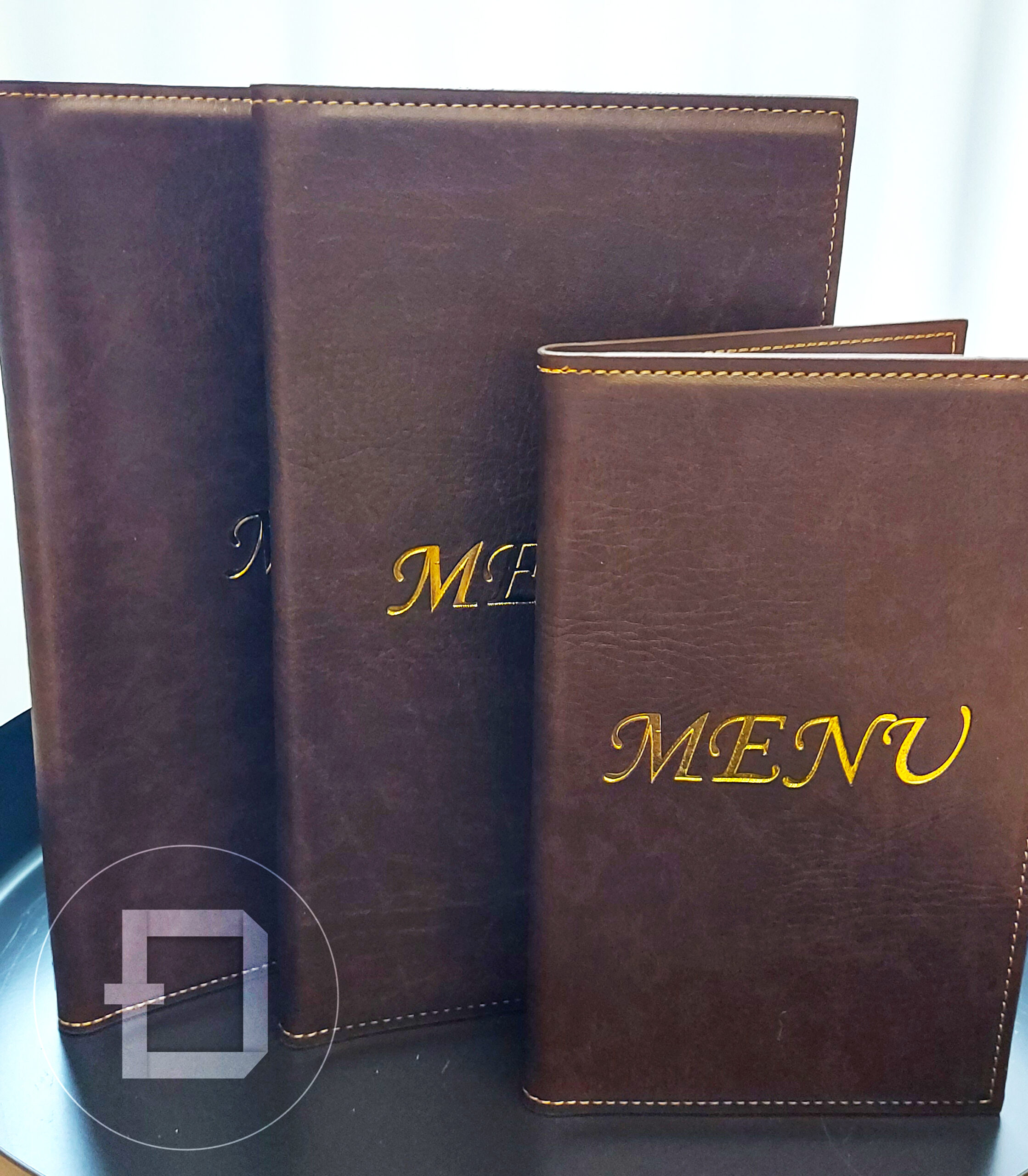 – Bìa PVC bảo vệ, chống nước và bẩn – Giấy menu tráng nhựa foliert – Lau được, không thấm nước
